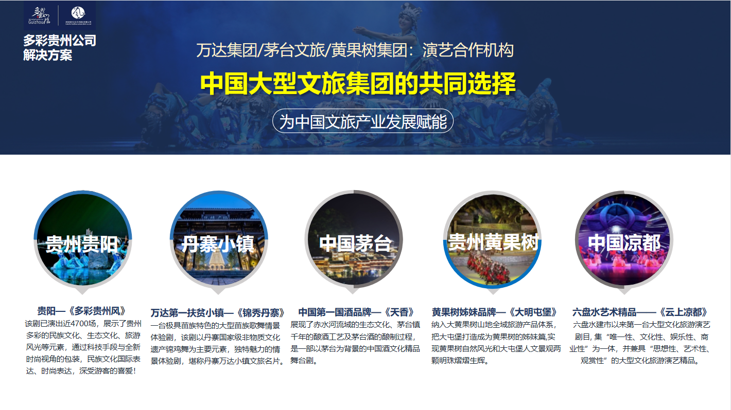 多彩贵州文化艺术股份有限公司成立于2006年,是全国文化体制改革工作先进单位,贵州省文化体制改革试点重点单位,是省内唯一被文化部授予“全国文化产业示范基地”的演艺文化企业。公司独家大型民族歌舞《多彩贵州风》目前已演出近4000场,巡演了美国、法国、加拿大、英国、俄罗斯、等二十余个国家。今年更与安徽电视台旗下的聚艺公司合作更加大力推广贵州民族文化与两地艺术文化交流。