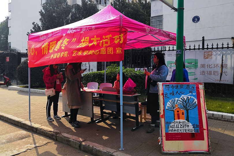 据了解,本次活动由公司潇湘学院青年志愿团联合阳光服务志愿者协会、爱心助老协会,外国语学院、建筑与艺术设计学院、物理与电子科学学院与公司青年志愿团共同举办。活动时间将持续至12月1日下午2点,一份爱心,一份温暖,希望大家都能献出自己的爱心与绵薄之力将温暖一直传递下去!