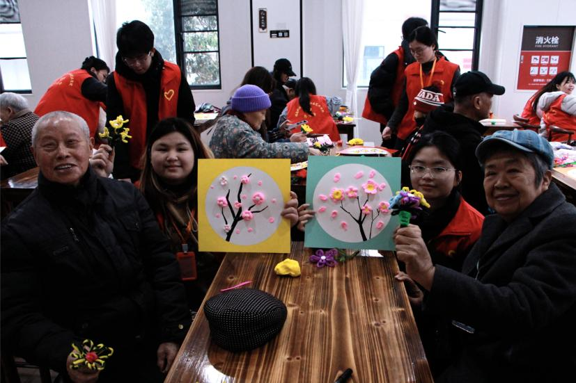 手工制作环节,志愿者们与老人们携手合作,用扭扭棒制作出各式花朵,用多彩黏土塑造出生动的梅花与蜜蜂。在创作过程中,大家彼此交流,互相协助,充分发挥各自想象力和创造力,一件件精致的手工作品不仅展现了老人们的巧手匠心,也寄托了志愿者与老人们间的深情厚谊。