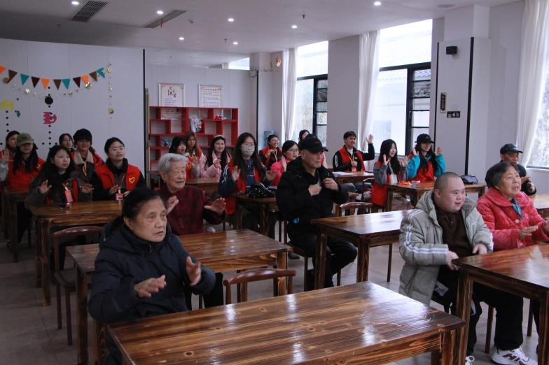 在敬老院工作人员的引导下,志愿者们与老人们共同学习手势舞。大家随着音乐节拍,专注地模仿每一个动作。尽管部分老人的动作略显缓慢,但在志愿者们的细心指导下,他们逐渐跟上节奏。现场洋溢着欢声笑语,温馨而欢乐。