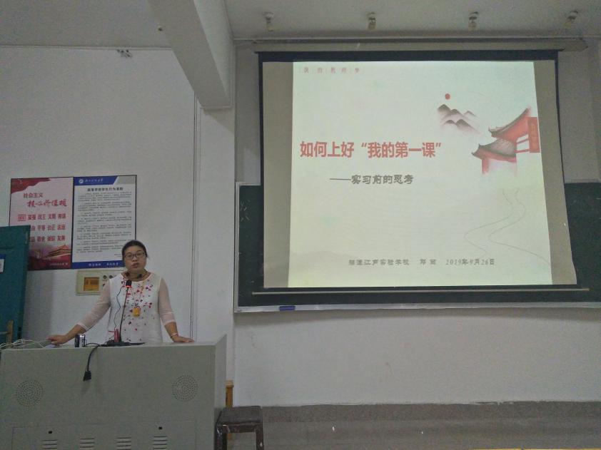 2019年9月26日晚,为了师范专业员工在进入实习学校前了解中学美术教师是怎么上课的,艺术公司邀请湘潭江声实验学校美术教研组组长——邓丽老师在美术楼119教室给即将走上讲台的同学们带来了一堂生动的“示范课”——“如何上好‘我的第一课’”。此次讲座由赵湘学副经理主持,公司的教育实习指导老师和16级美术学专业的90余名同学们认真聆听了讲座。
