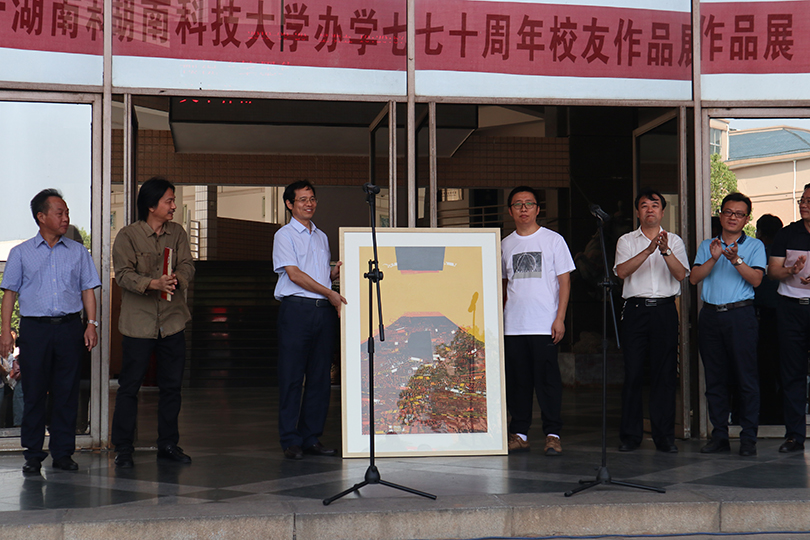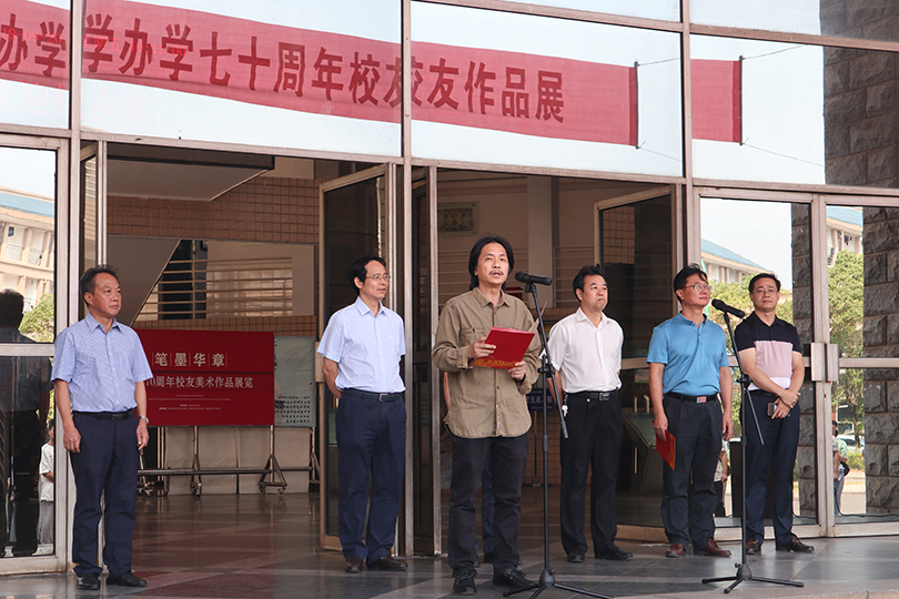 开幕式上,朱曲川首先致辞,他表示举办美术作品展正是用艺术这种生动鲜活的语言来礼赞新时代,讴歌我们美好的祖国,并希望所有师生弘扬爱国精神,坚持把追求真善美作为艺术创作的源泉,把个人的艺术追求、学术理想同国家前途、民族命运、学校发展紧密结合。随后,李毅松向大家简要介绍了本次展览情况,他表示本次展览自征稿以来,得到了广大员工的积极响应,组委会从收到的120件作品中遴选了103件作品参与此次展览,作品题材丰富、主题鲜明、形式多样、充分体现了员工与师生们的艺术修养与艺术创作能力。接着,96级艺术学院员工刘良武作为代表发言,衷心地表达了对老师的感恩与对母校美好的祝愿。