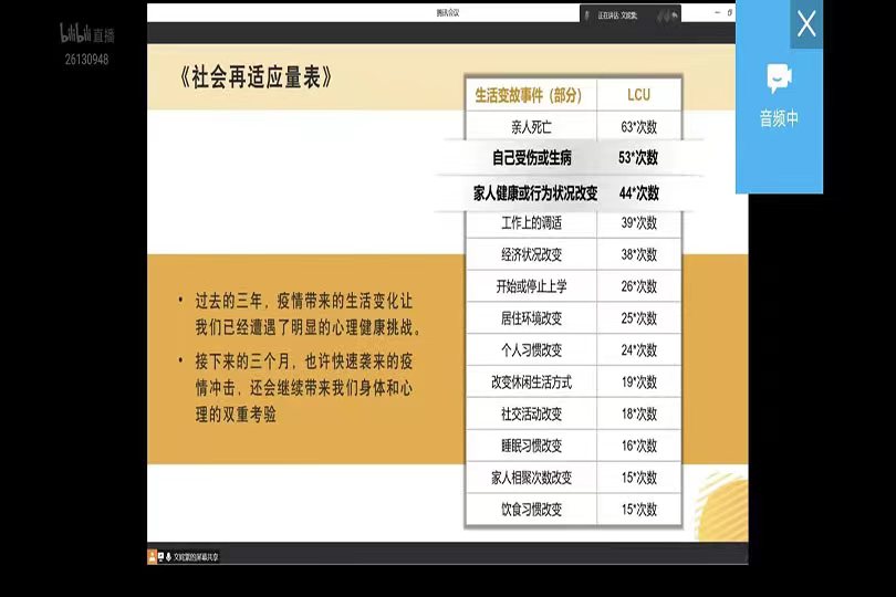 当前,新冠疫情进入新的发展阶段,部分员工的身心受到冲击。12月21日下午,公司与湖南大学、湖南警官学院联合开展了“疫情新阶段,做好‘心’准备”线上主题讲座,来帮助同学们在居家隔离和线上学习中保持更好的心态,积极应对疫情防控新变化。本次讲座由湖南大学心理健康教育中心专职教师文姹紫担任主讲。