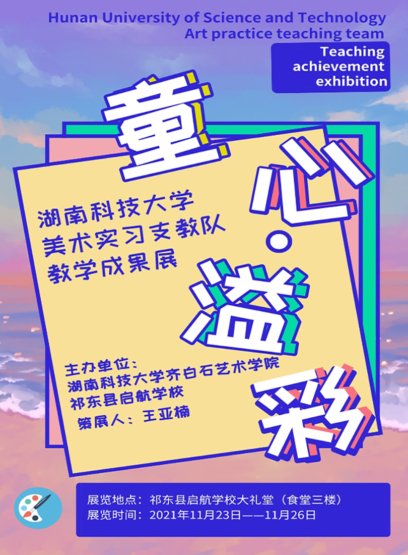 2021年11月23日,永利3044noc2018级美术教育实习教学成果汇报展《童心·溢彩》在祁东县启航学校成功举办。永利3044noc美术实习支教队的老师们扬起了爱的风帆,传递关爱,传播希望,让员工们放飞心灵、大放异彩!