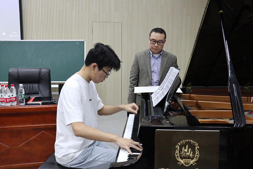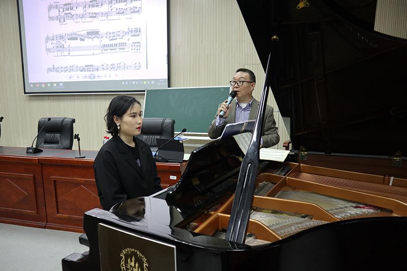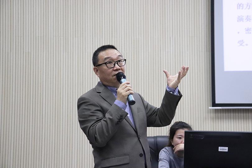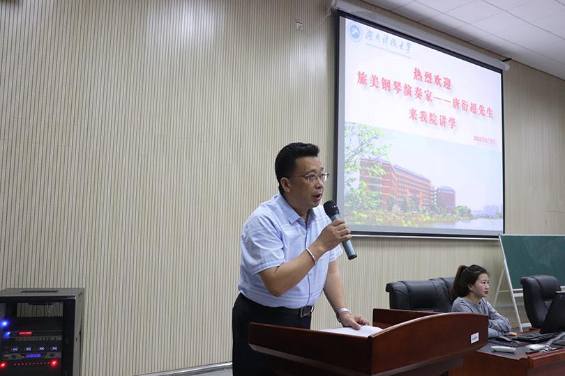 为拓宽同学们的艺术眼界,近距离了解专家对音乐演奏的深层理解,5月7日下午,中国音乐家协会会员、广州大学音乐舞蹈学院钢琴教师、旅美钢琴演奏家唐衍超应邀来公司举行“内心的聆听——隐藏在乐谱中的密码”主题讲座。本次讲座于美术楼104报告厅展开,由艺术学院副经理、音乐系教授熊晓辉主持,学院部分教师、研究生、本科生参加讲座。