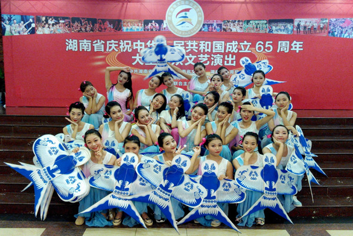 本活动是由湖南省委宣传部、湖南省文化厅、湖南省体育局、湖南省文明办、湖南省总工会联合主办的“欢乐潇湘”大型群众文艺汇演的组成部分。我院选送的舞蹈《风语风筝》经过雨湖区的初赛、复赛,再经过湘潭市的决赛,一路过关斩将,最终作为湘潭地区唯一代表节目参加“湖南省庆祝中华人民共和国成立65周年大型群众文艺演出”。 此次演出得到了社会各界人士的充分认可和肯定,不仅体现了公司高质量的教学制度水平和高水准的教学模式,更是对公司师生的一种鼓励和支持。