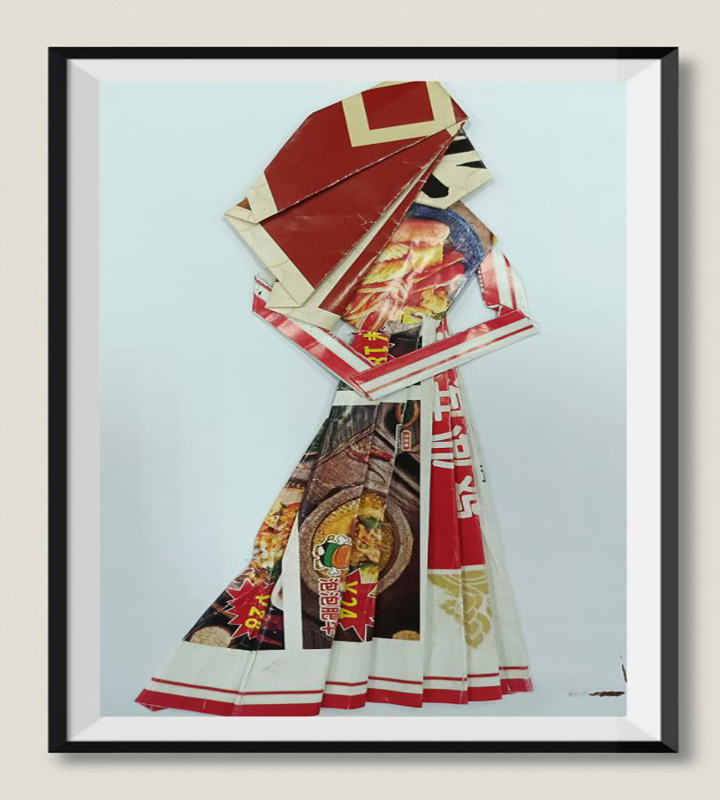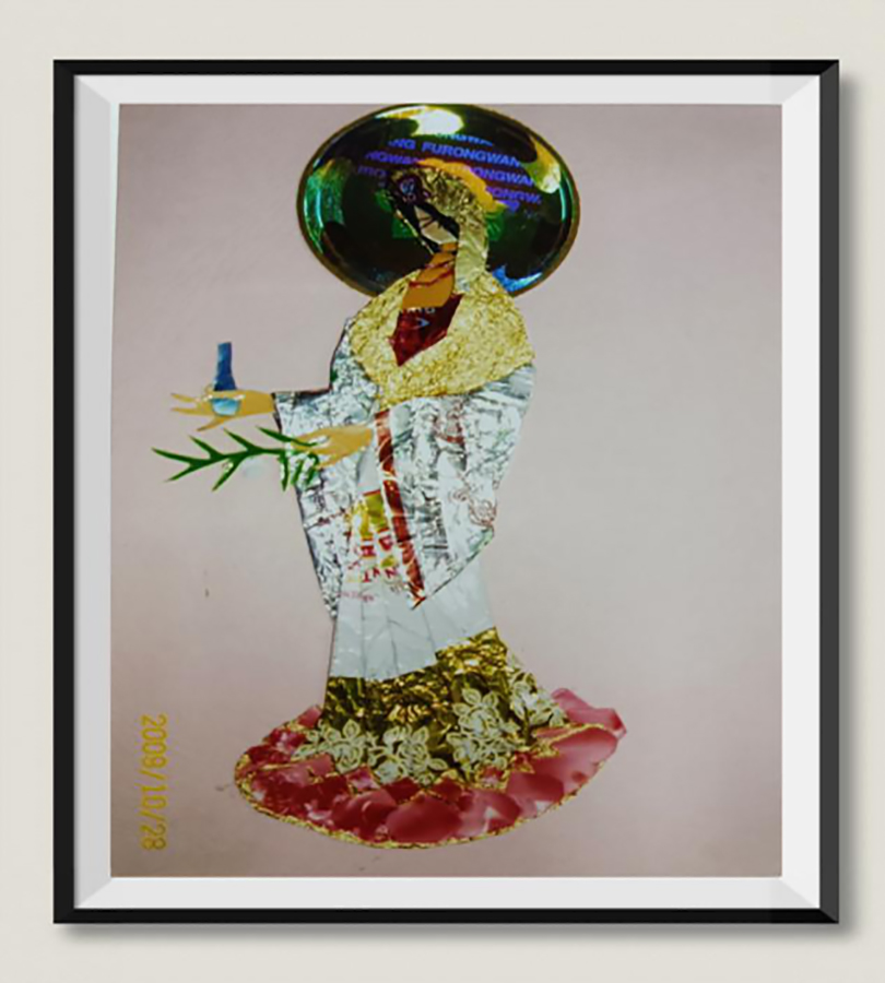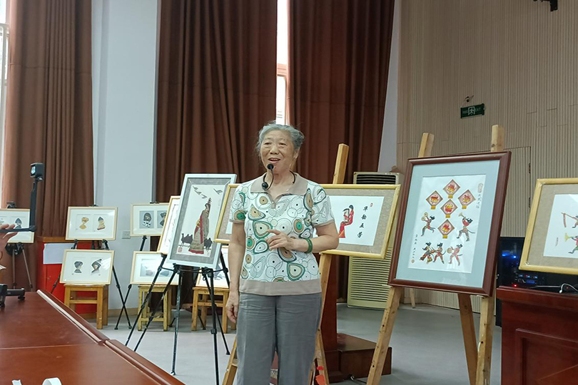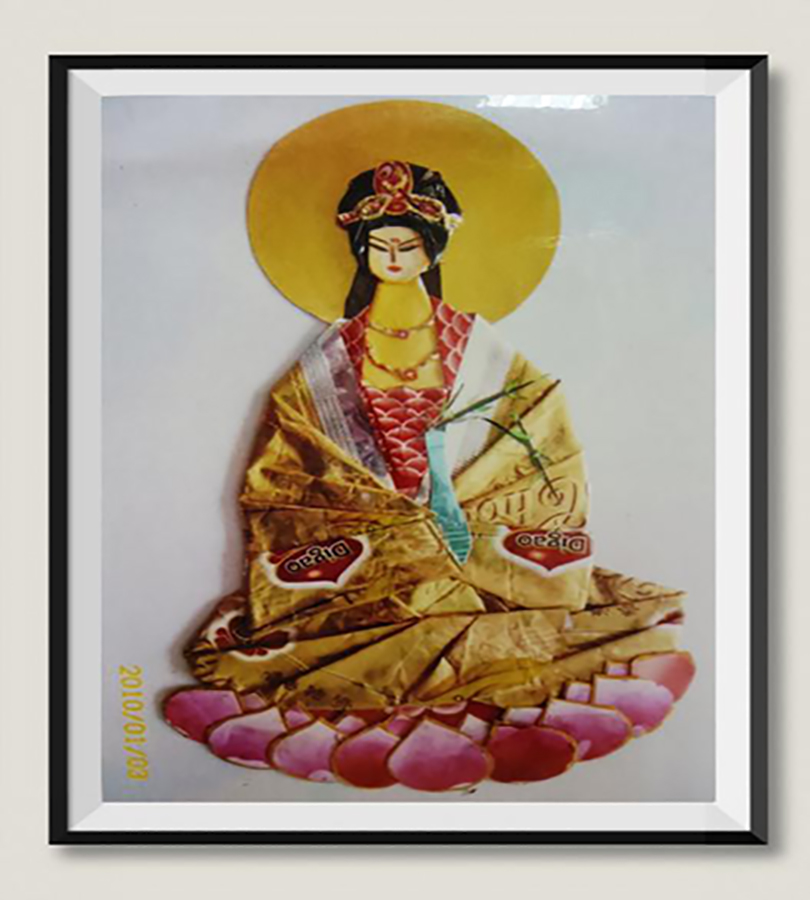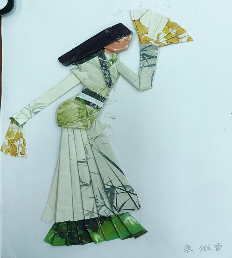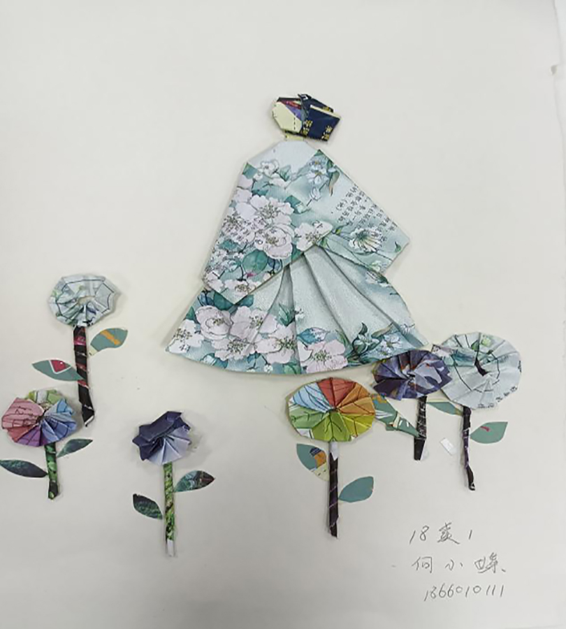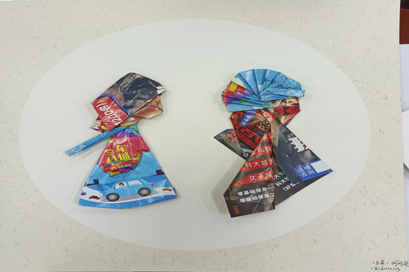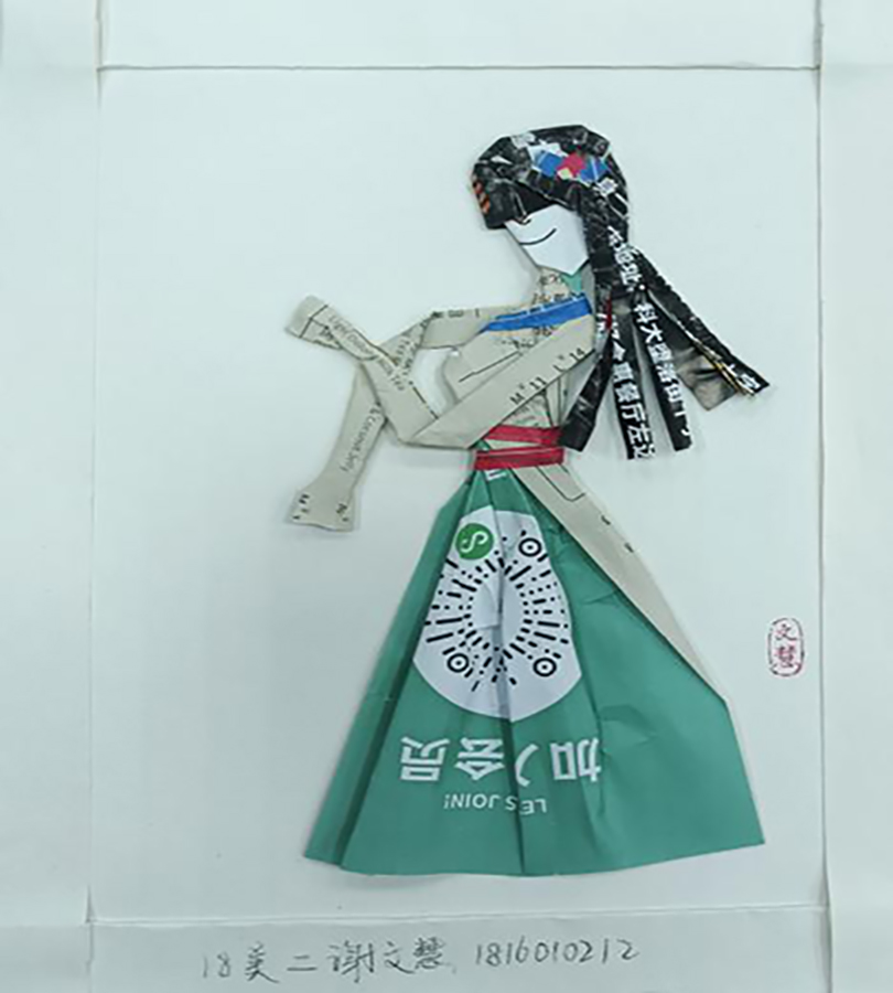 之后,贺老师结合《昭君出塞》、《华韵五芳》、《红楼梦-元春省亲》、《刘姥姥进大观园》等作品讲解了不同题材所采用的材料和制作方法。紧接着贺老师现场示范了如何“变废为宝”,强调折纸时要注意观察,选择合适的颜色和图案巧妙表现人物五官、脸型及整体形态。