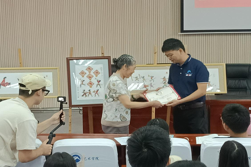 赵经理对贺老师在彩纸折叠方面的艺术成就做出了极大的肯定,并为其颁发了永利3044noc艺术学院特邀教师证书。赵经理强调了彩纸折叠艺术在用色造型上的巧妙,并建议同学们将同一题材的剪纸与折纸作品进行对比,体会不同民间艺术的内涵。