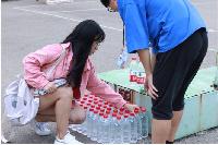 此时队伍的热闹喧嚣相比,那个在篮球架下,专注地埋首于地面的新生喝水的瓶子,默默地摆着地上水瓶的女孩是显得如此单薄,水瓶,包包,新生的衣服一件件地被她摆,瘦弱的身躯和远处的草坪合二为一,从远处看去,分不清哪个是她那个是大地,记者走近。她浑然未觉,细密的雨丝洒在身上,头发一片片地被打湿,当她抬起头来,被雨水淋湿了的发丝变黏在脸颊上,她起身用手拨开头发,继续为新生们收拾东西并为他们准备下训的热水。