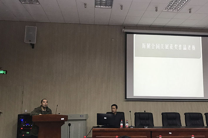 讲座中,邝明惠首先指出,极大多数的美术展览都有一定的规则要求和评选标准,全国美展也不例外。然后他根据第五届至第十二届全国美展优秀作品说明要求与准则,并且对大家提出要善于发现生活中的真善美、努力研究、发现自己、完善自我的建议。其次,他还希望大家积极投入全国美展的创作中,争取达到思想精心、艺术精湛、技术精良。最后,文牧江作出总结,他说,参加美展并且获奖会使生活产生很大变化,还提出了关于创作的两个基本要求:有别人想不到的想法、有别人做不到的功底。