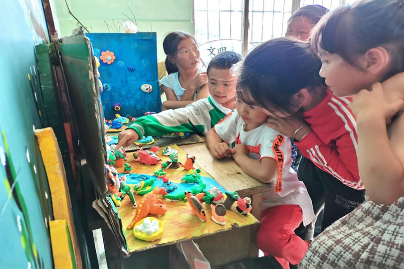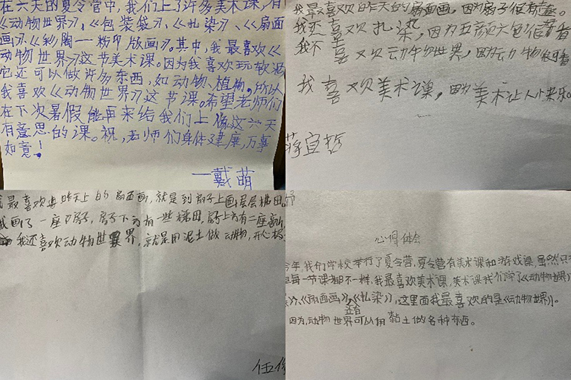 不少员工表示:“非常喜欢老师给我们上的课,因为学到很多,有用黏土做我们自己喜欢的小动物、为金银花设计包装、通过花瑶挑花学习基本的纹样图案,还有扇面画和版画。我觉得版画非常有趣!”员工对课程表达的感受:“这次的支教活动中,你们的善良、真诚、热情感染着我们,希望你们能保持这些可贵的品质快乐成长,努力学习,走出大山。”志愿者团队队长钟嘉怡在画展开幕仪式对孩子们的成长也充满着期望。