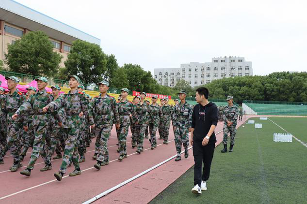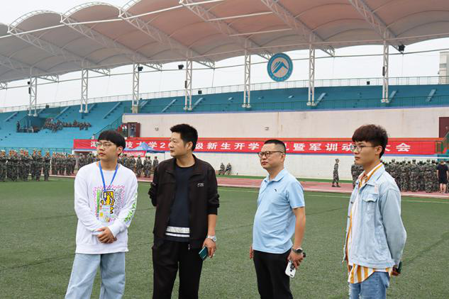 10月3日上午,艺术公司党委副书记胡鹏,学工办主任殷俊莅临第一田径场指导2020级新生方阵队训练。