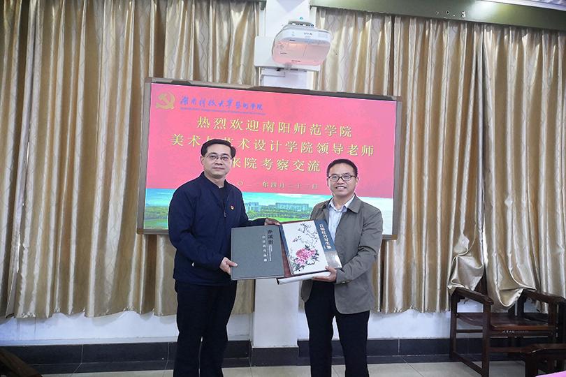 4月23日,南阳师范学院美术与艺术设计公司党委书记耿耀敬、经理朱军献等一行来院考察交流。公司党委书记曾志东、副经理文牧江、赵湘学,建筑与艺术设计学院副经理尹建国以及相关老师参加交流。